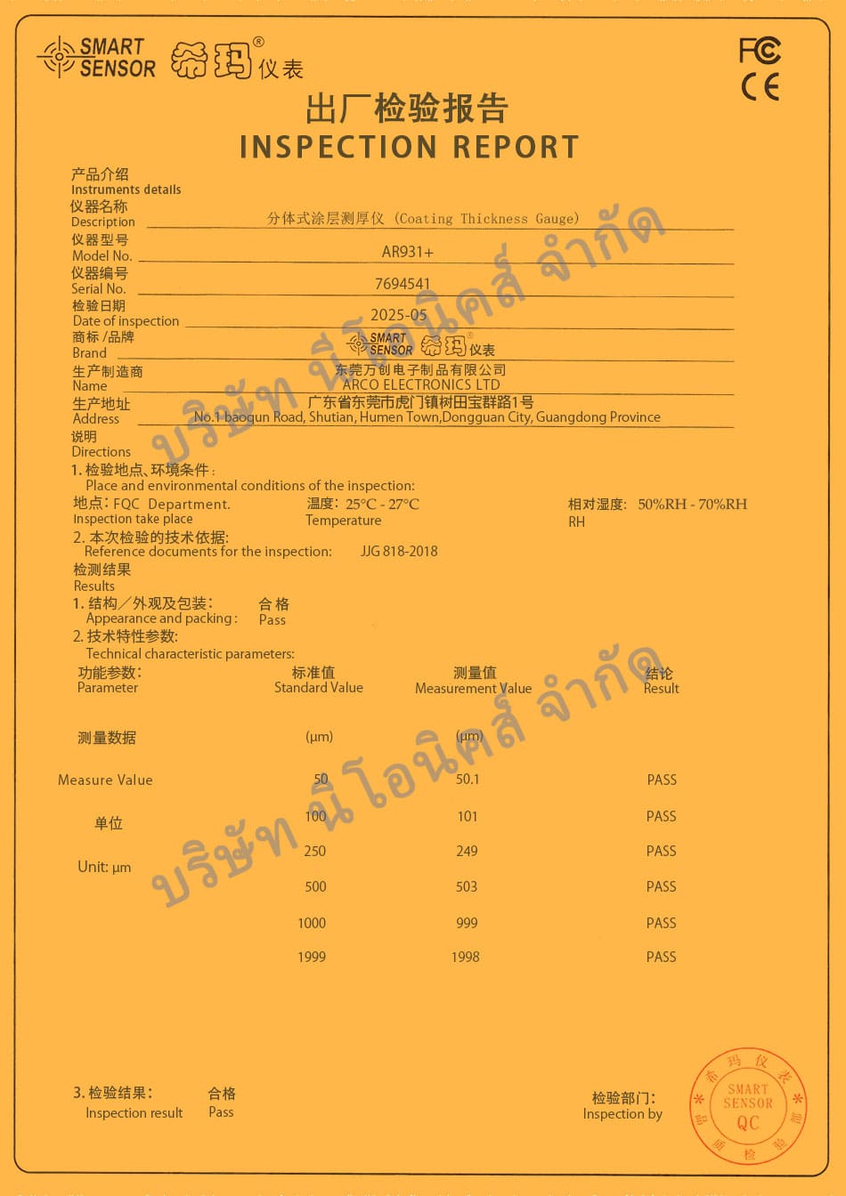 AR931+ สำหรับการวัดความหนาผิวเคลือบ สี การชุบ (เรียกอีกอย่างว่าเครื่องวัดสี) ใช้สำหรับวัดความหนาของสารเคลือบ ฟิล์ม สี การชุบ การเคลือบบนวัสดุที่มีพื้นผิวโลหะ ย่านการวัด 0~1800μm ด้วยค่าความผิดพลาดเพียง ±3% มาพร้อมกับแผ่นฟิลม์สำหรับสอบเทียบ ขนาดเล็กพกพาสะดวก ใช้งานง่าย แม่นยำ สินค้าคุณภาพสูงมีใบรับรอง Inspection Report จากโรงงาน ขายราคาถูก จัดส่งทั่วไทย