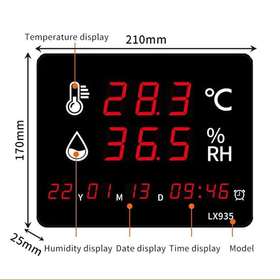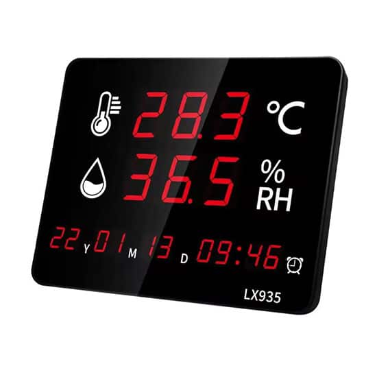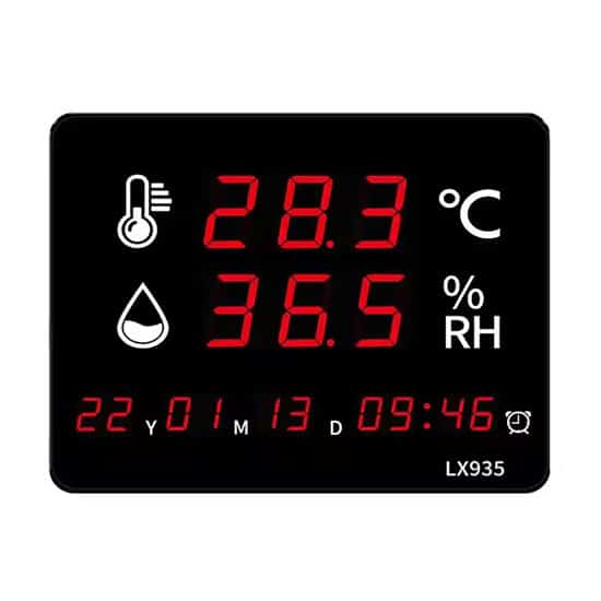 เครื่องมือวัดอุณหภูมิและความชื้น เทอร์โมไฮโกรมิเตอร์ รุ่น LX935 มีย่านวัดอุณหภูมิ -40°C~80°C และความชื้น 0~99.9%RH แสดงค่าวันที่และเวลา ทนต่อความร้อนและแรงสั่นสะเทือน มีเซ็นเซอร์ในตัว พร้อมจอแสดงผล LED คุณภาพสูง อ่านง่าย ไม่มีภาพซ้อน มองเห็นได้ชัดเจนจากหลายมุม